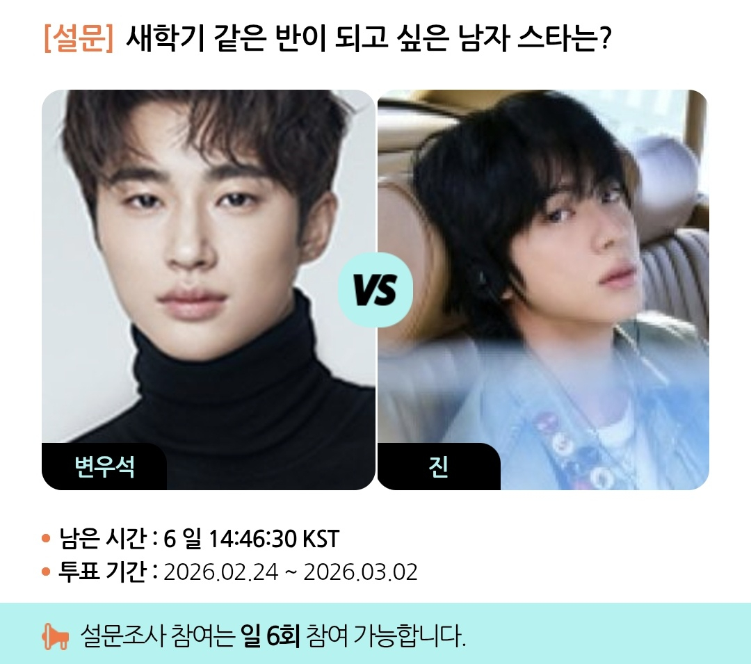 Learn more변우석vsBTS 진, 새학기 같은 반이 되고 싶은 男스타는? [스타폴]