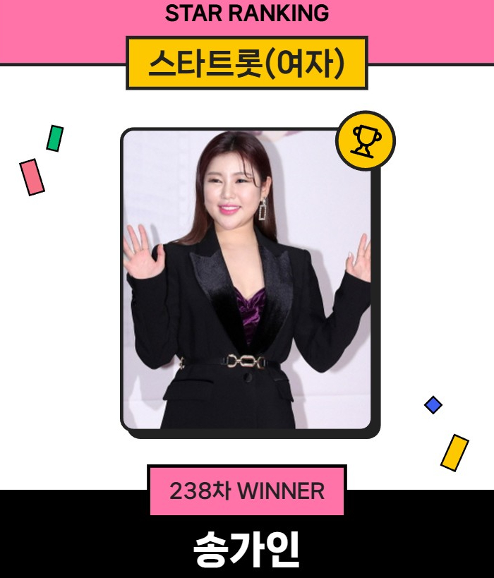 Learn more송가인, 238주 연속 1위 독주..스타랭킹 女트롯 여왕의 위엄
