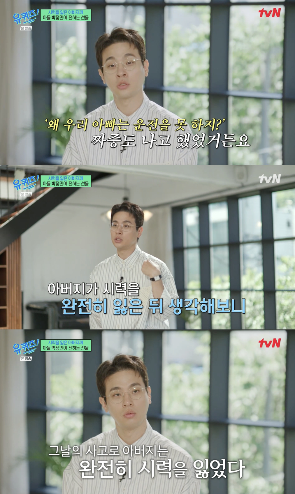 그는 "아버지가 원래 눈에 장애가 있으셨다. 어려서부터. 그래서 저희 집은 옛날부터 바닥에 뭘 놔두면 안 됐다. 아버지가 차고 다니기 때문이다"라며, 자연스럽게 삶 깊숙이 녹아 있는 가족의 일상을 이야기했다.