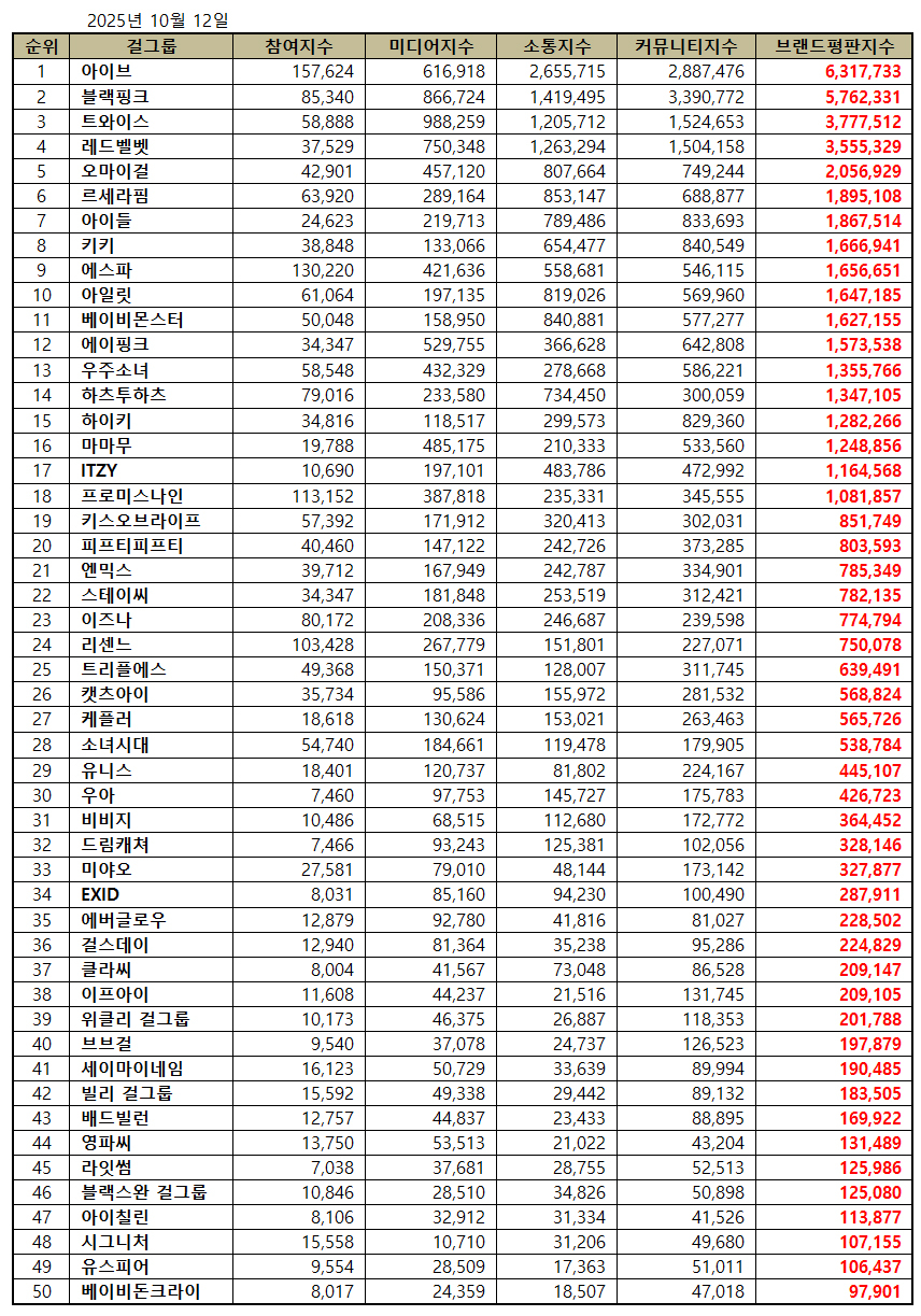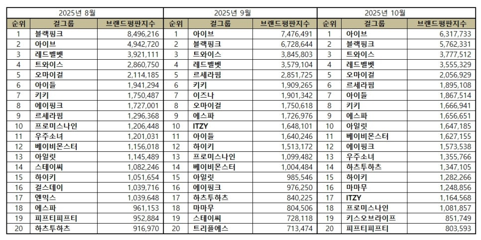 걸그룹 브랜드평판 2025년 10월 빅데이터 분석결과, 1위 아이브 2위 블랙핑크 3위 트와이스 순으로 분석됐다.