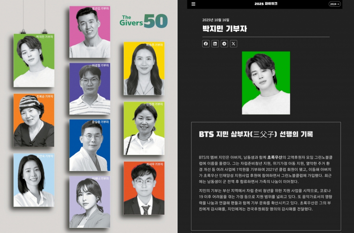 '더기버스50'은 각자의 자리에서 의미 있는 기부를 꾸준히 이어가는 기부자를 조명하는 프로젝트로, 지민에 대해 "음악가로서의 영향력을 나눔과 연결해 팬들과 함께 기부 문화를 확산시키고 있다"고 조명했다.