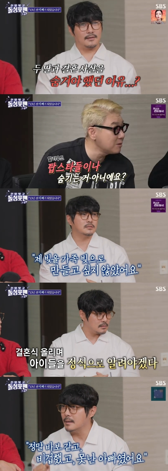 그는 "혼인신고를 하고 둘째가 생겨서 결혼식을 해야겠다 싶었는데 둘째가 나왔다, 첫째도 못 알렸는데 둘째를 알리기가 그랬다. 첫째가 중학교 1학년 사춘기인데 지나고 와서 생각해도 바보 같았고 비겁했고 못난 아빠였다"라고 한숨을 쉬었다.