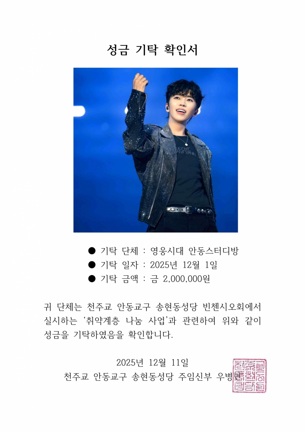 '영웅시대 안동스터디방'은 지난 2022년부터 연탄 나눔과 적십자회비 기부 등 지역 내 기부 활동을 꾸준히 이어오며 임영웅의 선한 영향력 실천에 앞장서고 있다.