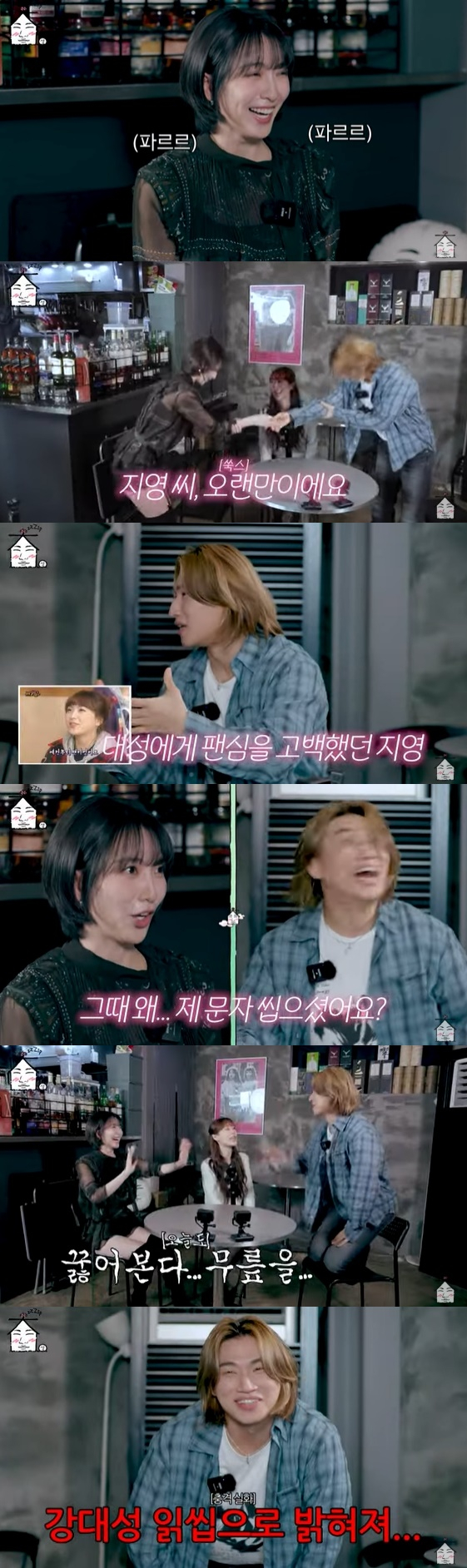 대성은 민망한 듯 "그 시절에는 러브라인의 상황극이 있었다. 에피소드로 지나가는 거다"라고 받아쳤고, 강지영은 "지나가는 거냐"라고 서운함을 토로했다.