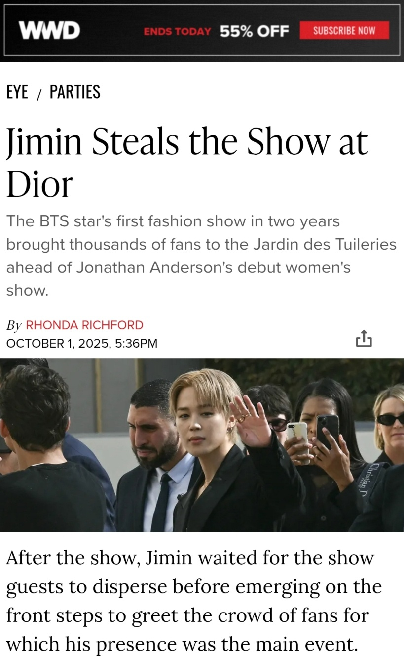 한편 지민은 앞서 2023년 1월 20일 개최된 '디올 남성 FW 2023-2024 쇼'에 참석, 당시 구름 인파를 동원해 AP통신과 로이터통신 등에서 집중 조명한 바 있으며 이번에도 역시 메인 캐릭터로서 K팝을 뛰어넘어 한국 대표 아티스트로서의 위상을 재확인시켰다.