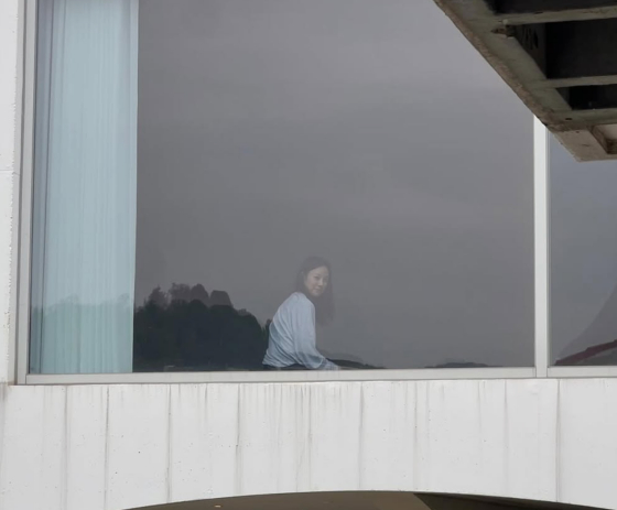 공개된 사진에는 큰 창을 자랑하는 건물 안에서 밖을 응시하는 모습이 담겼다.