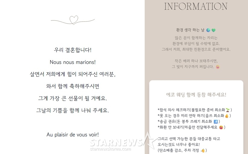 줄리안은 "참석 의사 체크하기(불필요한 준비 최소화), 못 오는 경우 미리 연락하기(음쓰 최소화), 송금 권유(돈 봉투 쓰레기 최소화), 화환 안 보내기(마음만 전달해주세요), 그리고 선택 가능한 분들 대중교통 타고 오시는 것도 너무나 좋아요. (탄소 배출 감소, 주차 걱정), 보너스 다회용기 챙겨 예식장 허용 해주시는 선의 남은 음식 가져가기(음쓰 최소화, 공짜 식사 한끼 더)"라고 적었다.
