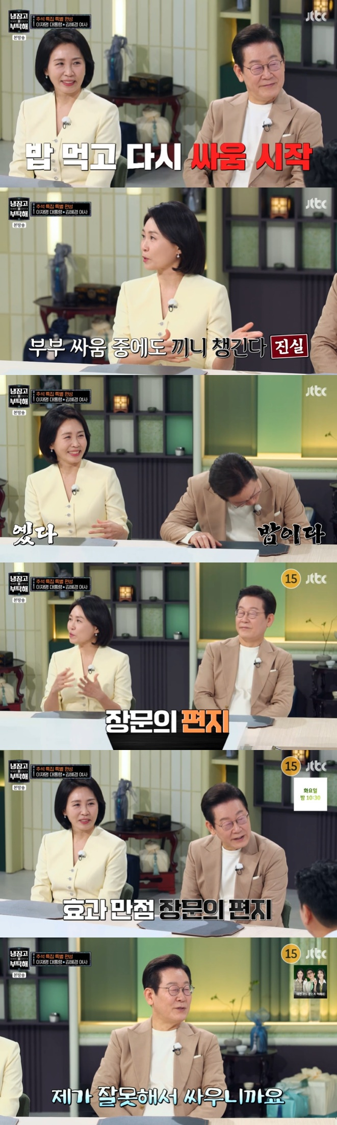 김성주는 "제작진에 따르면 두 분이 부부 싸움 중에도 끼니는 챙기면서 싸운다고 하더라"라고 하자 김혜경 여사는 "한창 싸우다가 밥을 안 챙기면 나중에는 밥을 안 줬다는 이유로 싸우니까 밥을 먹긴 먹는다"라고 했다. 이재명 대통령은 "밥을 탁 던진다"고 했고, 김혜경 여사는 "반찬통으로 놓는다"라고 했다.