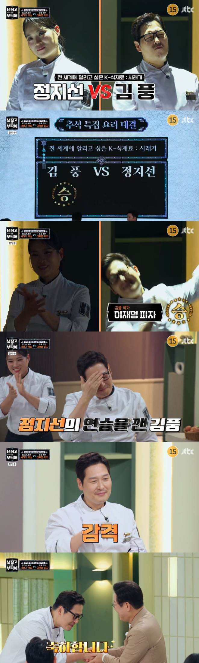 두 번째 대결에서는 정지선 셰프와 김풍이 나섰다. 정지선 셰프는 시래기 송편, 지짐떡을, 김풍은 부산 명물 '이재모 피자'를 패러디한 '이재명 피자'를 선보였다. 김풍은 요리 도중 비트물을 면포에 거르려다가 밀가루에 그대로 쏟는 실수를 했다. 이재명 대통령은 김풍의 피자를 먹고 "의외다. 오 맛있다"라고 했고, 김혜경 여사는 "왜 맛있냐"라며 놀랐다. 대통령 부부는 '김풍 매직'에 홀려 김풍에게 손을 들어줬다.