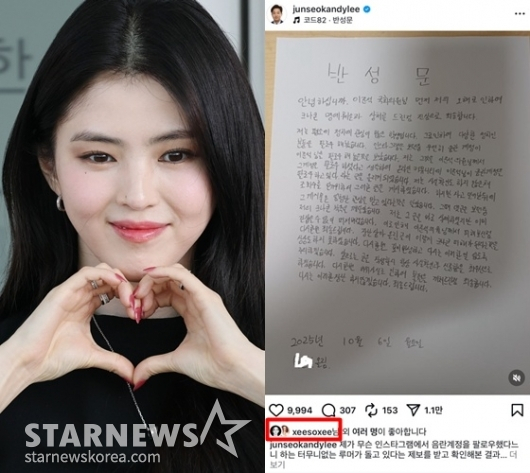 앞서 6일 한소희는 SNS 탓에 '정치색' 논란에 휩싸였다. 이날 이준석 개혁신당 대표가 인스타그램에 자신에 대해 명예훼손한 가해자의 자필 반성문을 게재했는데. 한소희가 해당 게시물에 '좋아요'를 뜻하는 '하트'를 클릭해 화제의 중심에 선 것이다.