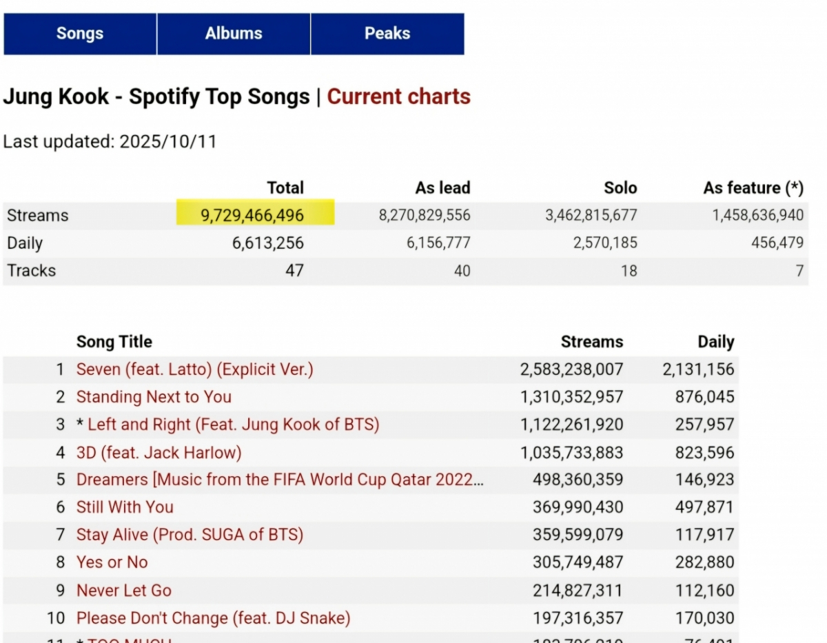 정국은 최근 세계 최대 음원 스트리밍 플랫폼 스포티파이 개인 계정(프로필) 모든 크레딧으로 누적 97억 스트리밍(필터링 전)을 돌파했다.