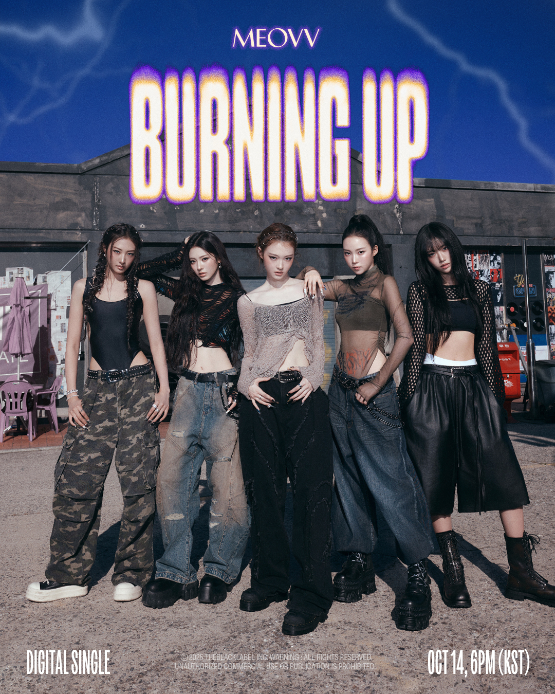 더블랙레이블은 13일 공식 SNS 채널을 통해 14일 발표되는 MEOVV(수인, 가원, 안나, 나린, 엘라)의 새 디지털 싱글 'BURNING UP'(버닝업) 두 번째 타이틀 포스터를 공개했다.