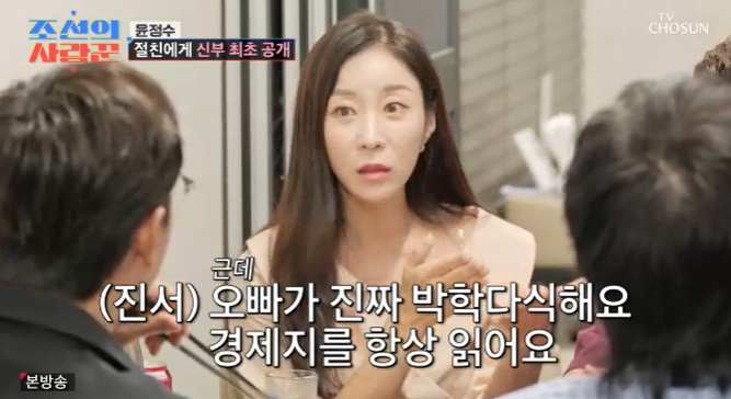 이에 임형준은 "형수님 학력을 찾아봤는데 놀랐다"라며 원진서가 이대 석사 출신인 점을 언급했고, 원진서는 "오빠가 진짜 박학다식하다. 경제지를 항상 읽는다"라고 했다. 임형준은 "형수님이 순수하다"고 했고, 배기성은 "잘 만났다"라며 웃었다.