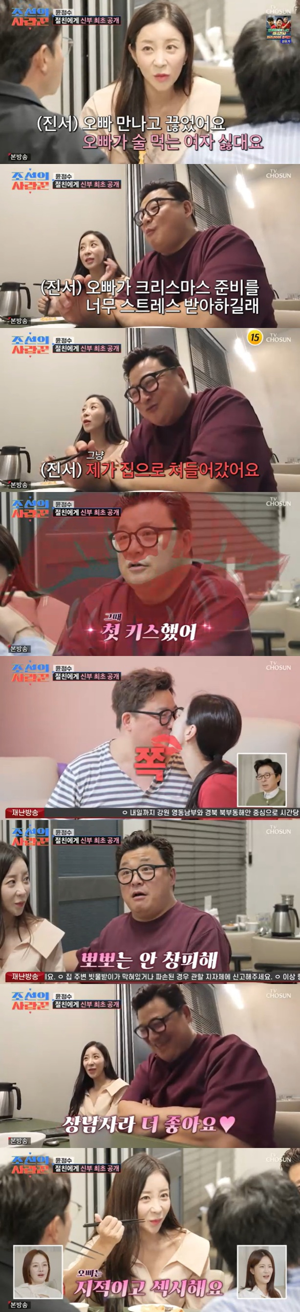 임형준은 "형수님은 술 안 드시나?"라고도 물었고, 원진서는 "술 끊었다. 오빠가 술 먹는 여자 싫어한다고 했다"라고 답했다. 윤정수가 "크리스마스 때 한 병 정도 딱 먹는다"라고 했고, 배기성이 "작년부터 사귀었는데 우리한테 말을 안 했냐"라고 서운해했다. 이에 원진서는 "크리스마스 때 썸이었는데 오빠가 이벤트 준비에 스트레스 받는 것 같길래 내가 이브에 집에 쳐들어갔다"라고 했고, 윤정수는 "그때 첫 키스했어"라고 밝혔다. 원진서는 "사귀기 전에도 두 번째 봤을 때 오빠가 이마에 뽀뽀를 했다"고 했다.