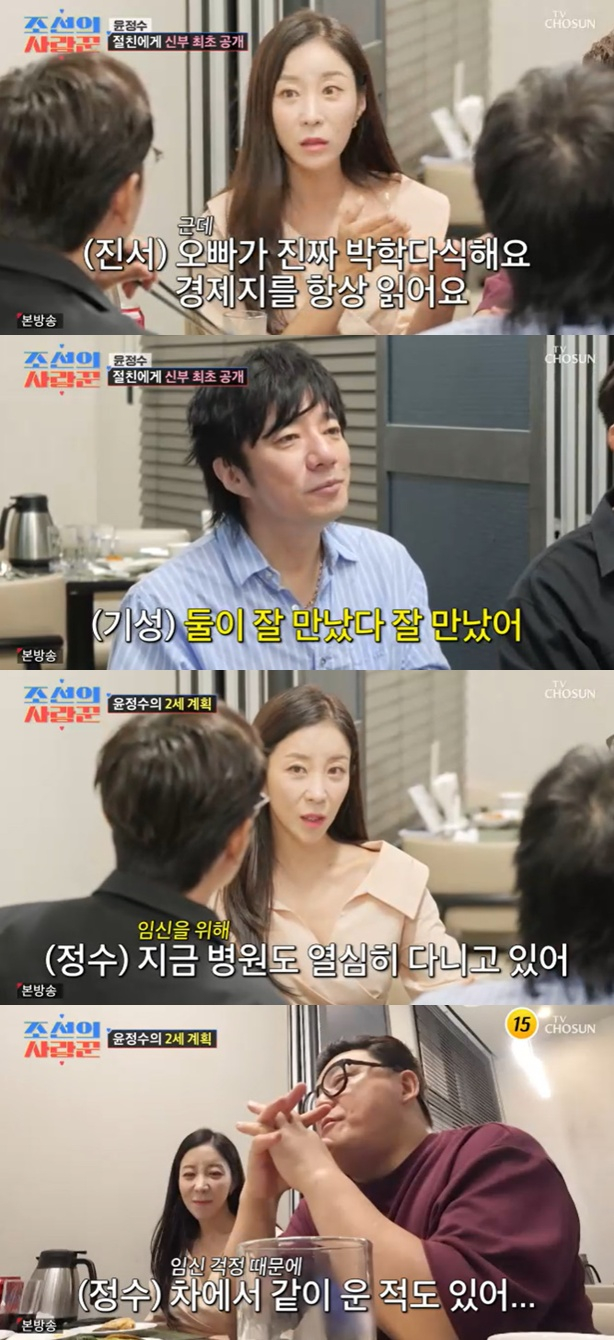 윤정수는 "(원진서가) 나를 너무 좋아해서 샘도 많은데 그게 하루 이상 안 간다. 그게 좋다"라며 "'오빠 딴 여자 만난 거 아냐?'라고 묻고 뒤져보진 않는다"라고 전했다. 원진서는 "오빠는 휴대폰을 항상 열어놓는다"라고 했고, 배기성은 "얘 휴대폰 3개인 거 모르시냐"라고 장난쳤다. 배기성은 "둘이 좋은 파트너 같다. 개그 파트너"라고 했고, 원진서는 윤정수에 대해 "오빠가 지적이고 섹시하다"라고 자랑했다.