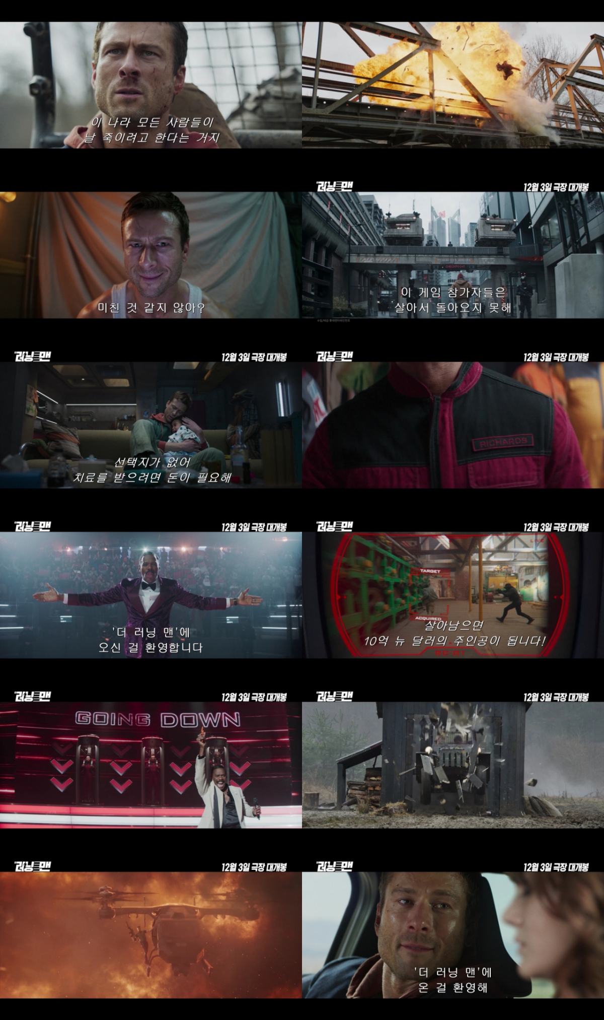 공개된 2차 예고편은 "앞으로 30일 동안 이 나라 모든 사람들이 날 죽이려고 한다는 거지" 라는 '벤 리처즈'의 대사로 시작해 무자비한 생존 게임의 서막을 알린다. 아픈 딸의 치료비를 마련하기 위해 게임에 참가하는 '벤 리처즈'의 결단과 드러나는 '더 러닝 맨' 프로그램의 진실은 긴장감 넘치는 전개를 예고한다.