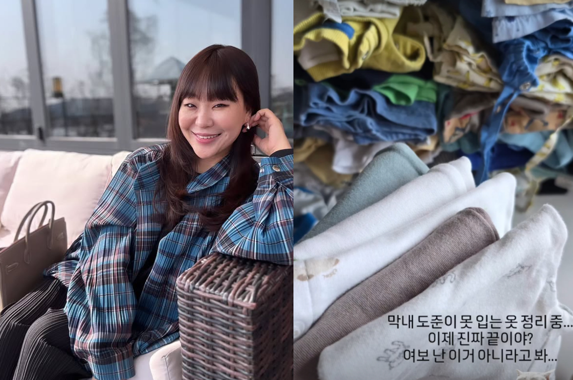 정주리는 14일 자신의 인스타그램에 "막내 도준이 못 입는 옷 정리 중"이라는 글과 함께 사진을 공개했다.