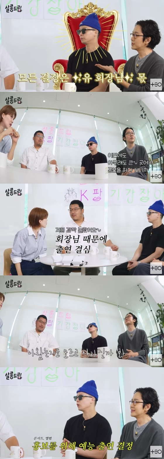 정엽은 "완전체로 출연하는 건 진짜 처음이다. 저희도 셋이 카메라 앞에 있는 게 긴가민가하다"라고 얼떨떨한 표정을 지었다. 그는 예능 출연을 결심한 이유에 대해 "제가 리더이긴 한데 사실상 (나얼이) 회장님이시다. 별명이 '유 회장님'이다. 아무래도 큰 곳에서 공연을 하다 보니까 부담이 됐는지"라고 밝혔다.