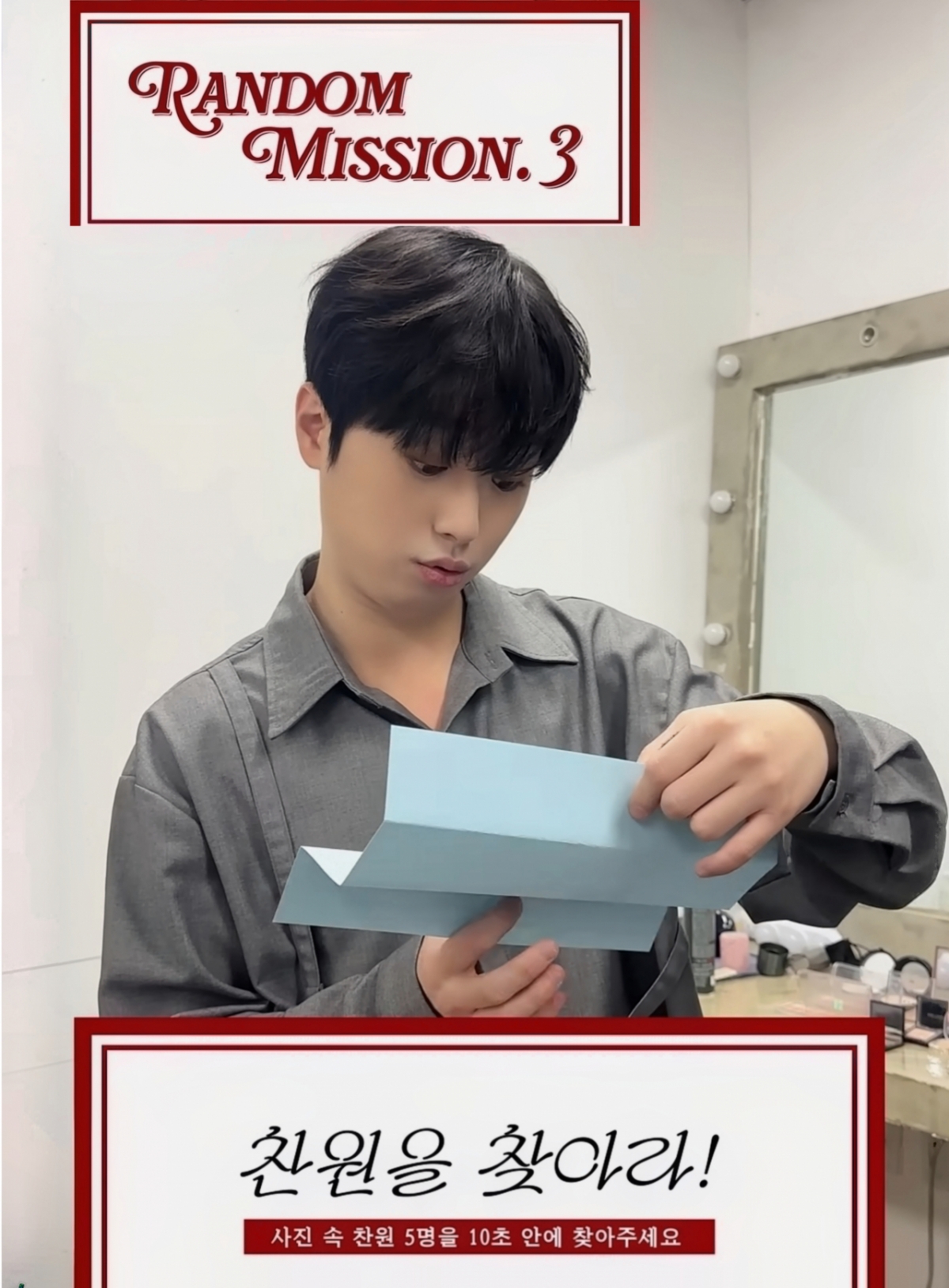 이찬원은 이내 "잠깐만! 솔직히 얘기해요 이거 다 꽝 넣었죠?"라며 의심의 눈초리로 스태프를 바라봤고, 스태프는 한 장 더 뽑을 것을 권했다. 이찬원은 "예?"라며 의아한 표정을 지으며 한 장을 더 뽑았다. 미션지에는 '찬원을 찾아라 사진 속 찬원 5명을 10초 안에 찾아주세요'라고 적혀 있었다.