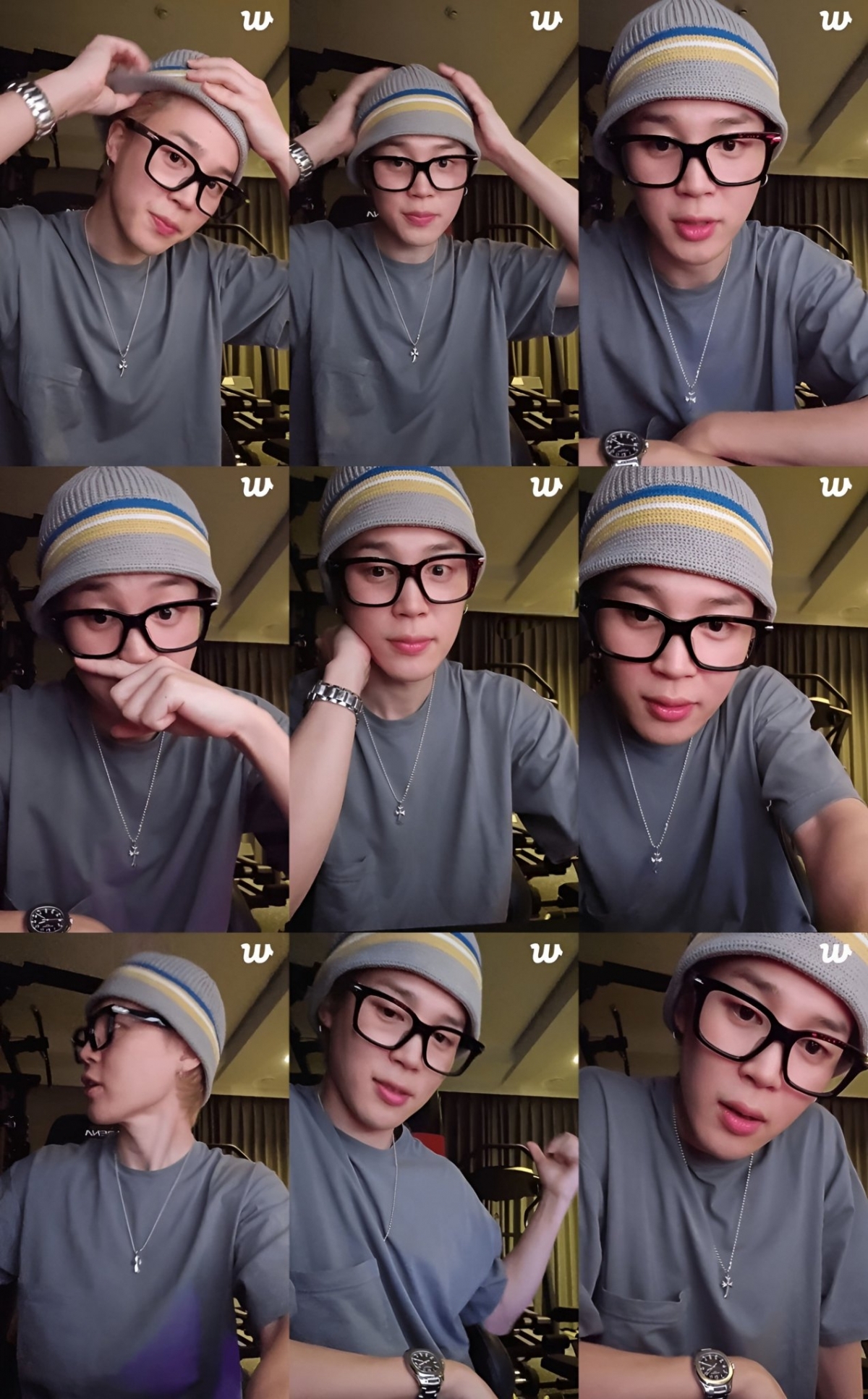 라이브 방송에서 메이크업하지 않은 자연스러운 얼굴에 비니와 뿔테 안경을 착용한 지민은 수수하면서도 눈부신 동안 미모로 등장해 팬들의 마음을 사로잡았다.
