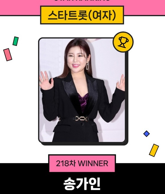 송가인은 지난 9일 오후 3시 1분부터 16일 오후 3시까지 진행된 218차 스타랭킹 스타트롯 여자 부문에서 5만3492표를 획득하며 1위에 올랐다.
