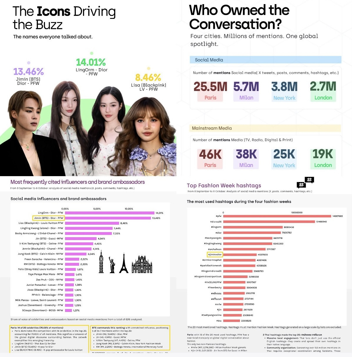 보고서에 따르면, '파리 패션위크'는 4대 패션위크 중 가장 높은 소셜 미디어 2,550만 회 언급량을 기록해 밀라노 570만 회, 뉴욕 380만 회, 런던 270만 회를 크게 앞서며 전체 미디어 점유율의 70% 이상을 차지했고, 그중에서도 디올(Dior)은 35.04%로 브랜드 부문 1위를 기록했다.