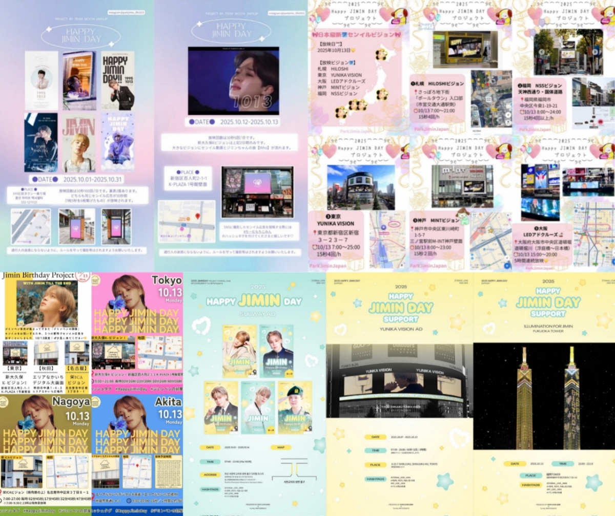 방탄소년단(BTS) 지민의 생일(10월 13일)을 기념해 일본 팬들이 광고와 랜드마크 점등식, 애드 크루즈 등 다양한 이벤트로 축하했다.