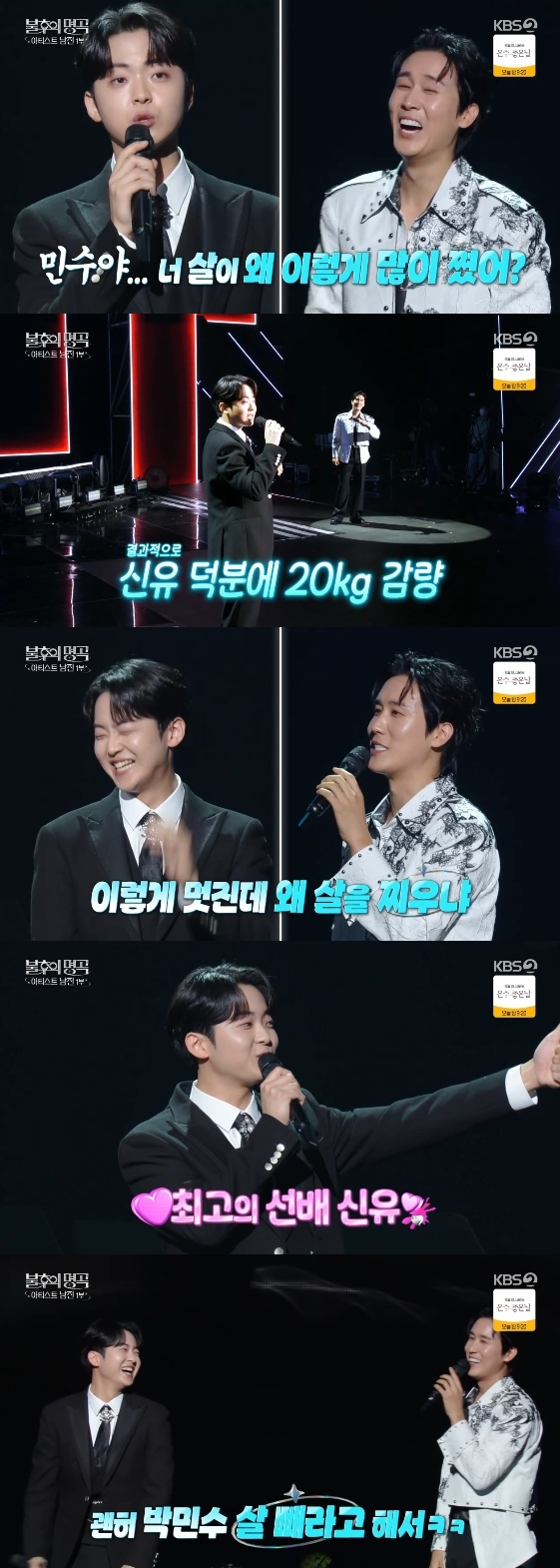 그는 무대가 끝난 뒤 "제가 신유 선배님을 좋아할 수밖에 없었던 일화가 있다. 제가 지금보다 무게가 증량됐을 때 신유 선배님 콘서트에 간 적이 있다. 신유 선배님이 게스트들과 인사를 하던 중 저를 찾으시길래 벌떡 일어나 인사드렸는데 '민수야, 너 살이 왜 이렇게 많이 쪘어? 그러면 안 돼. 살 빼야 해'라고 하시더라. 결과적으로 신유 선배님 덕분에 20kg을 감량했다"라고 말했다.
