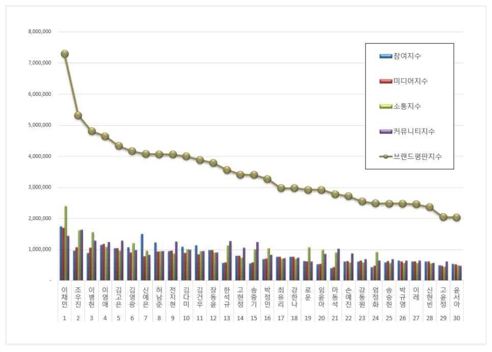 배우 브랜드평판 1위를 기록한 이채민 브랜드는 참여지수 1,750,849 미디어지수 1,697,554 소통지수 2,408,982 커뮤니티지수 1,437,806이 되면서 브랜드평판지수 7,295,191로 분석됐다.
