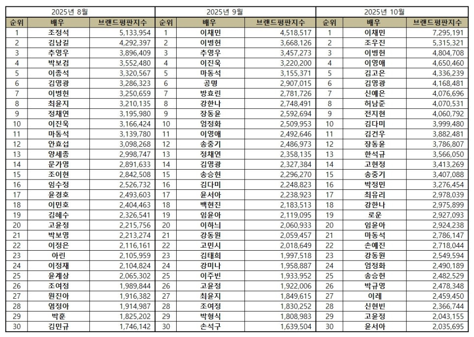 이번 배우 브랜드평판조사는 2025년 9월 21일부터 2025년 10월 21일까지 이채민, 조우진, 이병헌, 이영애, 김고은, 김영광, 신예은, 허남준, 전지현, 김다미, 김건우, 장동윤, 한석규, 고현정, 송중기, 박정민, 최유리, 강한나, 로운, 임윤아, 마동석, 손예진, 강동원, 엄정화, 송승헌, 박규영, 이레, 신현빈, 고윤정, 윤서아, 김우빈, 임시완, 이진욱, 하정우, 조정석, 공명, 공유, 방효린, 배현성, 전여빈, 박용우, 이주명, 천우희, 김보라, 박보영, 이선빈, 염혜란, 조여정, 윤현민, 이서진, 이준혁, 이종석, 정인선, 한지민, 김혜수, 정해인, 현빈, 조아람, 이엘, 유진, 김선영, 김영대, 김지영, 송지효, 강하늘, 김남길, 존조, 김정현, 정성일, 이정재, 이주빈, 박형식, 황정민, 정일우, 한지현, 차태현, 이원정, 이하늬, 이성민, 박해준, 이이경, 이제훈, 문소리, 박희순, 고규필, 강미나, 박지현, 이광수, 라미란, 유연석, 윤상현, 오의식, 서인국, 최귀화, 임성재, 이미숙, 차승원, 차우민, 김광규, 이정은에 대한 브랜드 빅데이터 분석으로 이뤄졌다.