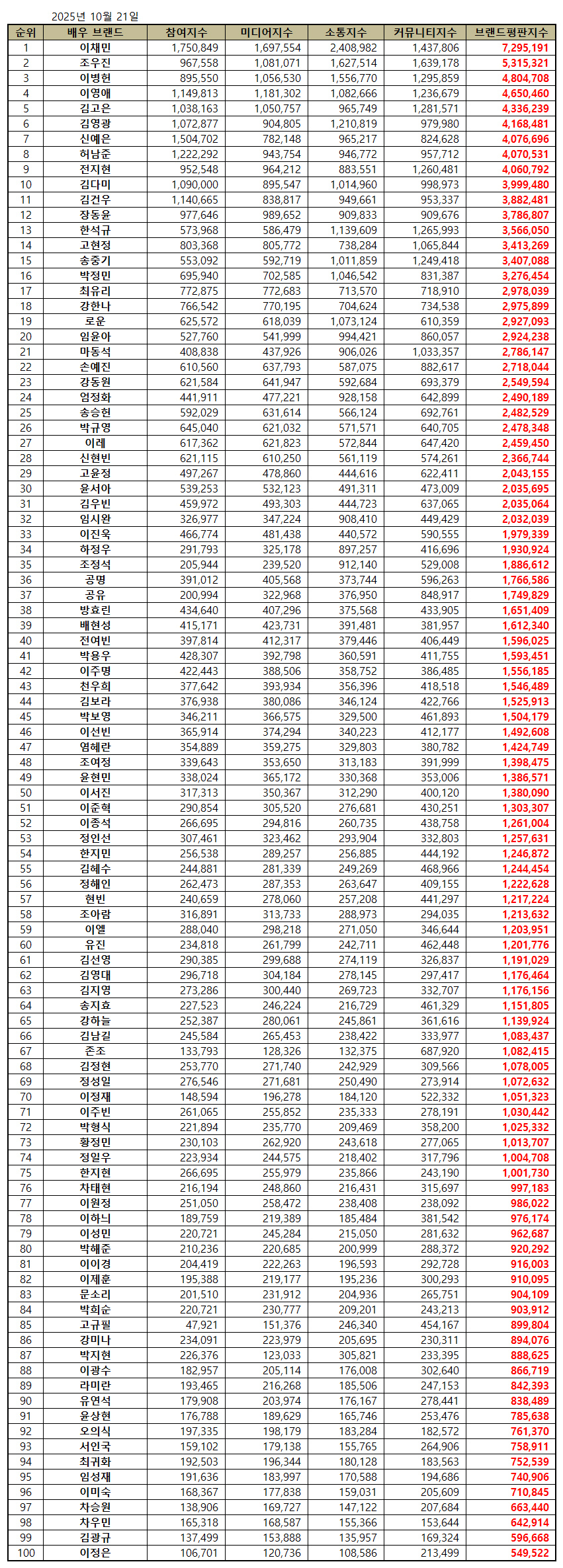 한국기업평판연구소는 2025년 9월 21일부터 2025년 10월 21일까지 방영한 드라마, 영화, OTT에서 출연중인 배우 100명의 브랜드 빅데이터 186,695,012개를 소비자들의 브랜드 참여량, 미디어량, 소통량, 커뮤니티량으로 측정하여 브랜드평판 알고리즘으로 지수화했다. 지난 9월 배우 브랜드 빅데이터 144,869,968개와 비교하면 28.87% 증가했다.