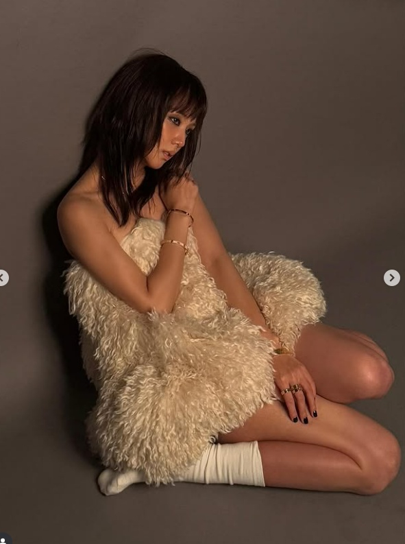 지수는 처피뱅 헤어에 시크한 분위기도 만들어 보였다.