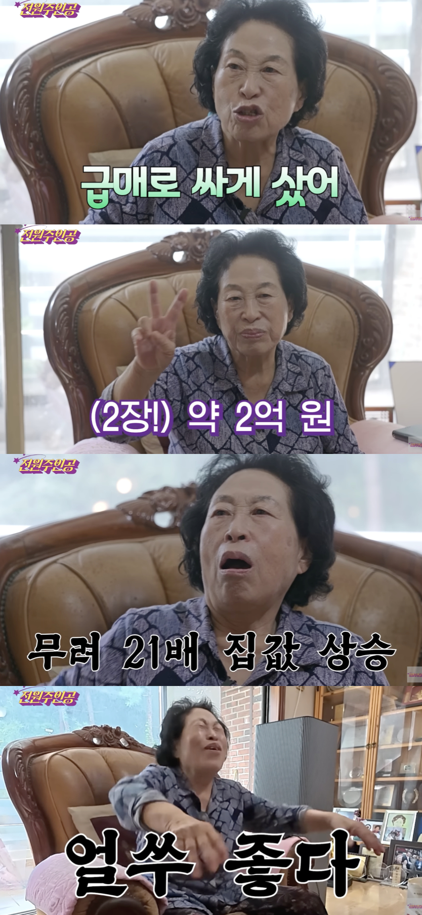 21배에 달하는 폭등 소식을 들은 전원주는 어깨춤을 추며 기쁨을 감추지 못했다. 그는 "이 집이 나를 살린 집이다. 여기서 내 이름이 뜨고, 돈이 모이기 시작했다. 부동산에서 몇 번이나 팔라고 찾아오더라. 그런데 팔기 싫다"라며 집에 대한 깊은 애정을 드러냈다.