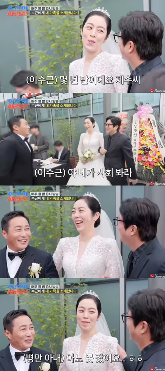 이수근은 "몇 년 만이냐, 제수씨"라고 인사했고, 김병만 아내 역시 반가워하며 "감사하다. 사회도 봐주시고"라고 말했다.