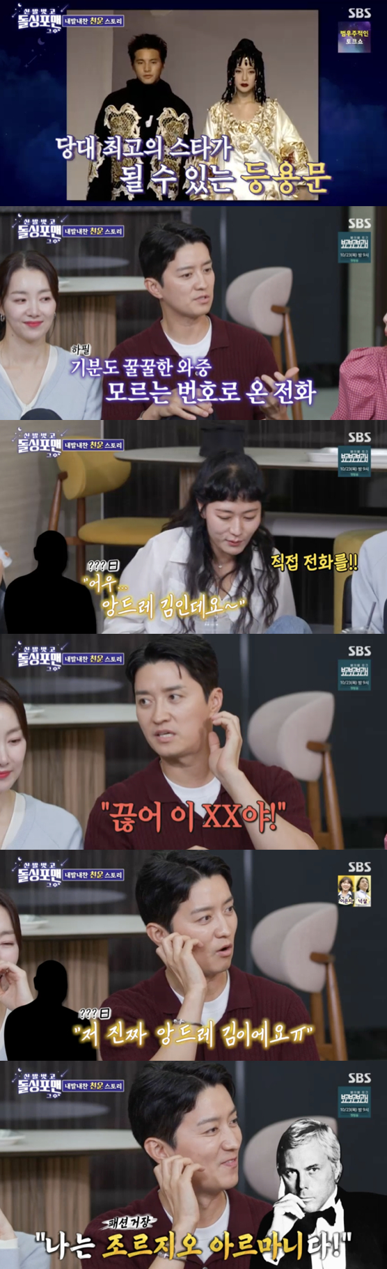 그는 이어 "그래서 '네가 진짜 앙드레 김이면 난 조르지오 아르마니다'라고 했다. 그런데 같은 전화가 세 번이나 오고, 전해주는 내용이 너무 디테일해서 이상했다. 나중에 알고 보니 진짜 앙드레 김 선생님이었다"고 밝혀 모두를 폭소하게 했다.