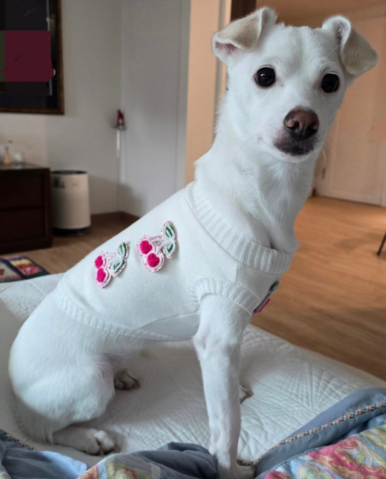 이와 함께 공개한 사진에는 신동엽 가족의 반려견 크림이가 니트 옷을 입은 모습이 담겼다. 크림이는 체리 와펜이 달린 옷을 입고 앙증맞은 자태를 뽐냈다.