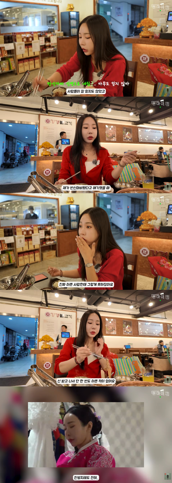 그러면서 "신을 받지 않으려고 하는 누름굿도 벌였다. 누름굿에만 1~2억 원을 썼지만 효과가 없었다. 마지막에는 반신마비까지 왔다. 의사가 '평생 이러고 살아야 할 수도 있다'고 하더라. 엄청 많이 울었다. 마지막에 제 입에서 '너 아니면 네 아빠 데리고 간다'라는 말이 튀어나왔다. 아빠에게 상황을 설명했더니 아빠가 저승사자 나오는 꿈을 보여줬다더라"고 밝혔다.