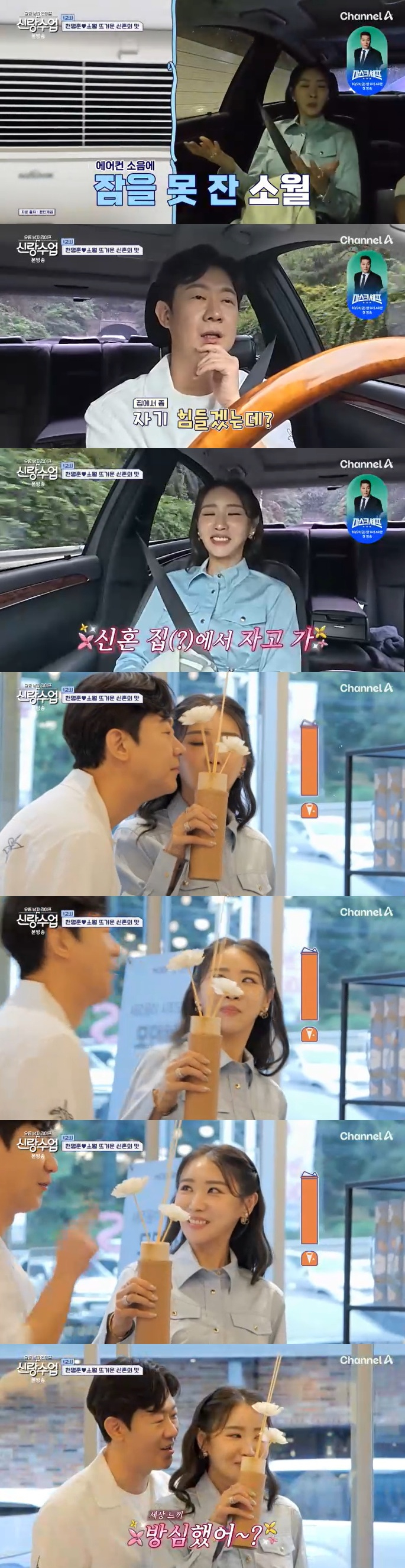 소월이 하품하며 "우리 집에 에어컨 물이 차서 소리가 나서 잠을 못 잤다"라고 하자 천명훈은 "아이고야. 오늘 집에서 자기 좀 힘들겠는데"라며 틈새 플러팅을 했다.