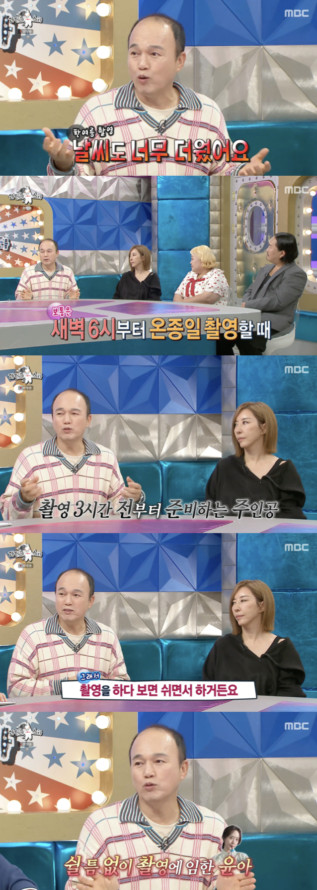 그는 "주인공은 새벽 6시부터 온종일 촬영할 때 주인공은 3시간 전부터 준비한다. 촬영을 하다 보면 자기 컨디션을 위해 쉬면서 한다. 그런데 이 친구는 솔선수범한다. 전 액션신 찍으면 대역을 좋아하는데 액션, 요리, 뒷모습까지 본인이 다 하겠다고 한다. 이래서 잘 되는구나 했다"라고 전하며 윤아의 프로페셔널한 태도에 감탄했다.