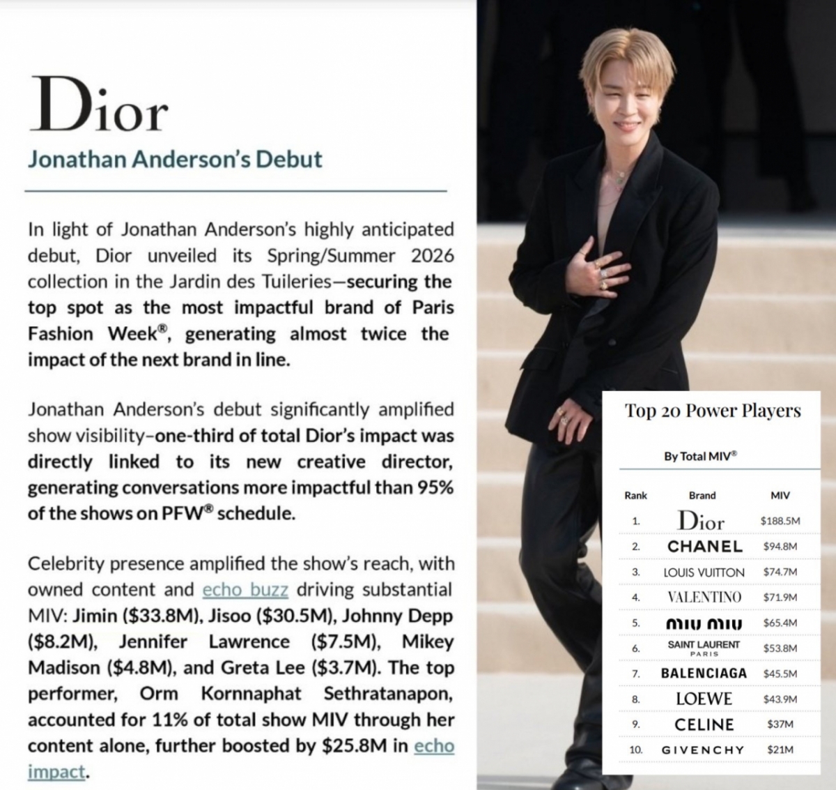 글로벌 패션 데이터 분석 기관 '런치메트릭스(Launchmetrics)'에 따르면 지민은 디올(Dior) 컬렉션 참석만으로 디올 전체 MIV(1억 8850만 달러)의 약 18%를 혼자 기여했다. 이는 파리 패션위크 10위권 브랜드 전체 MIV보다 높은 수치로, 지민의 영향력이 패션계에 미친 남다른 파급력을 명확히 보여준다.
