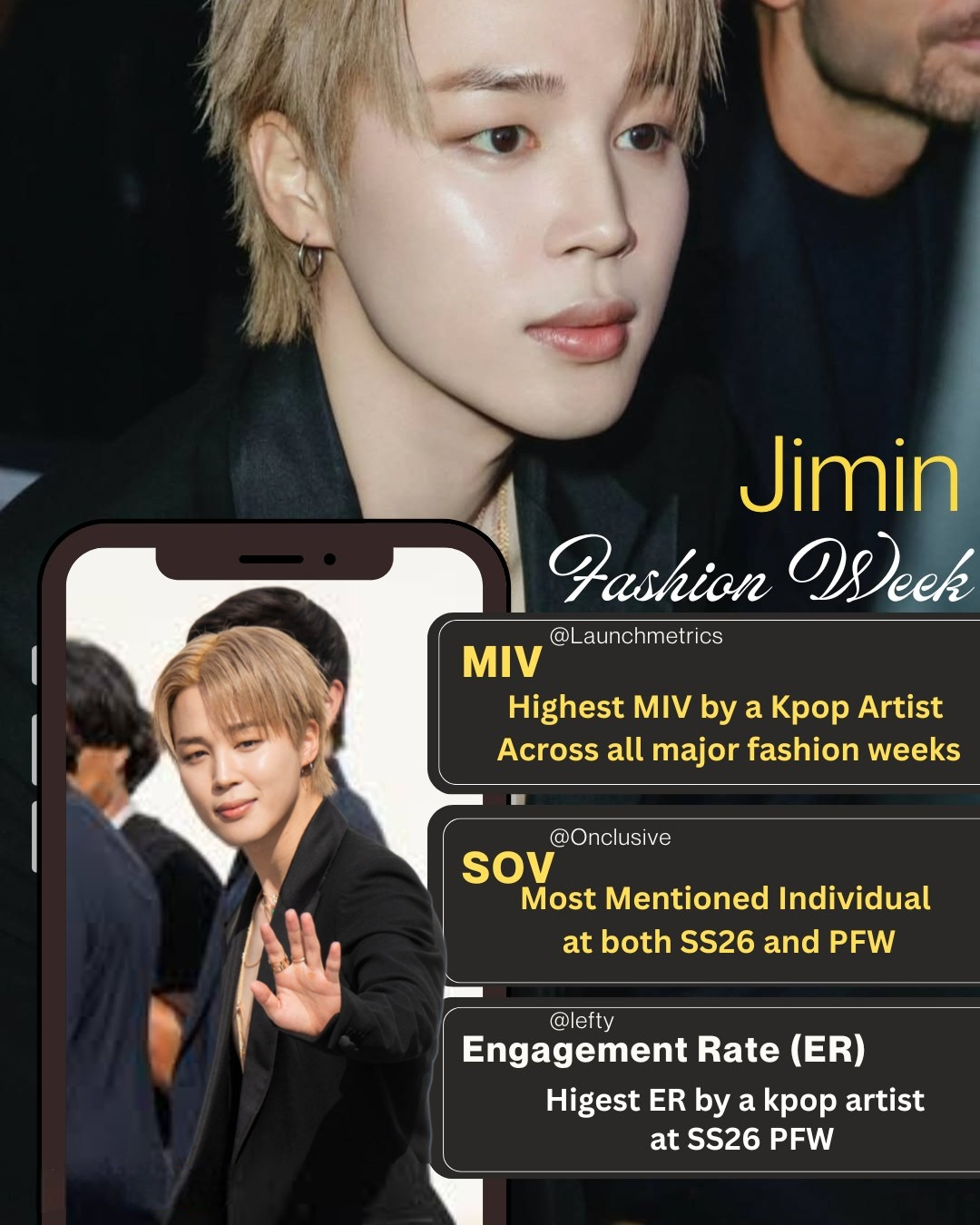 지민은 패션위크 기간 동안 단 한 번의 인스타그램 게시물을 올렸음에도 전 세계 패션 미디어와 SNS를 중심으로 K팝 아티스트 중 가장 높은 MIV(노출과 조회)와 가장 높은 SOV(언급량)를 기록했고, 또한 파리 패션위크 기간 동안 가장 높은 참여율(Engagement Rate, 적극적 반응)을 달성했다.