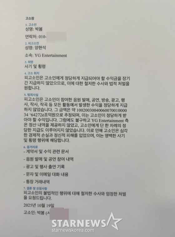이보다 앞서 박봄은 같은 날 새벽 "박봄 Hates YG. 인터넷을 하시는 사랑하는 국민 여러분 YG가 박봄한테 뭐했는지 샅샅이 알아봐 주세요. 감사합니다"라는 글과 함께 고소장을 공개해 파장이 일었다.박봄이 공개한 고소장은 양현석 대표에 대한 것으로, 그는 "피고소인은 고소인에게 정당하게 지급되어야 할 수익금을 장기간 지급하지 않았으므로 이에 대한 철저한 수사와 법적 처벌을 원합니다"라고 적었다.