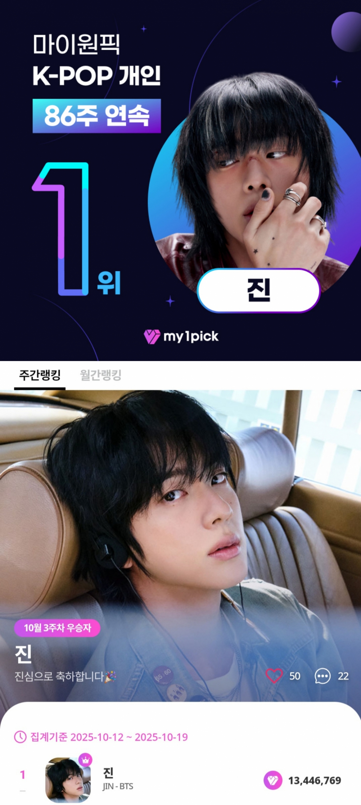 방탄소년단(BTS) 진이 '마이원픽(MY1PICK)' 주간랭킹에서 86주 연속 1위를 기록하며 막강한 인기를 빛냈다.