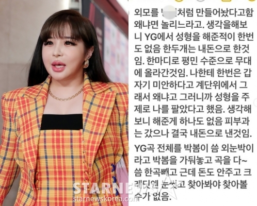 그룹 투애니원(2NE1) 멤버 박봄이 또다시 YG엔터테인먼트(이하 YG)를 저격한 게시물을 올렸다가 삭제했다. 박봄은 지난 23일 자신의 인스타그램에 "화가 나지만 귀찮아서 시작만 해봤다"며 메모장을 캡처한 사진을 게재했다.