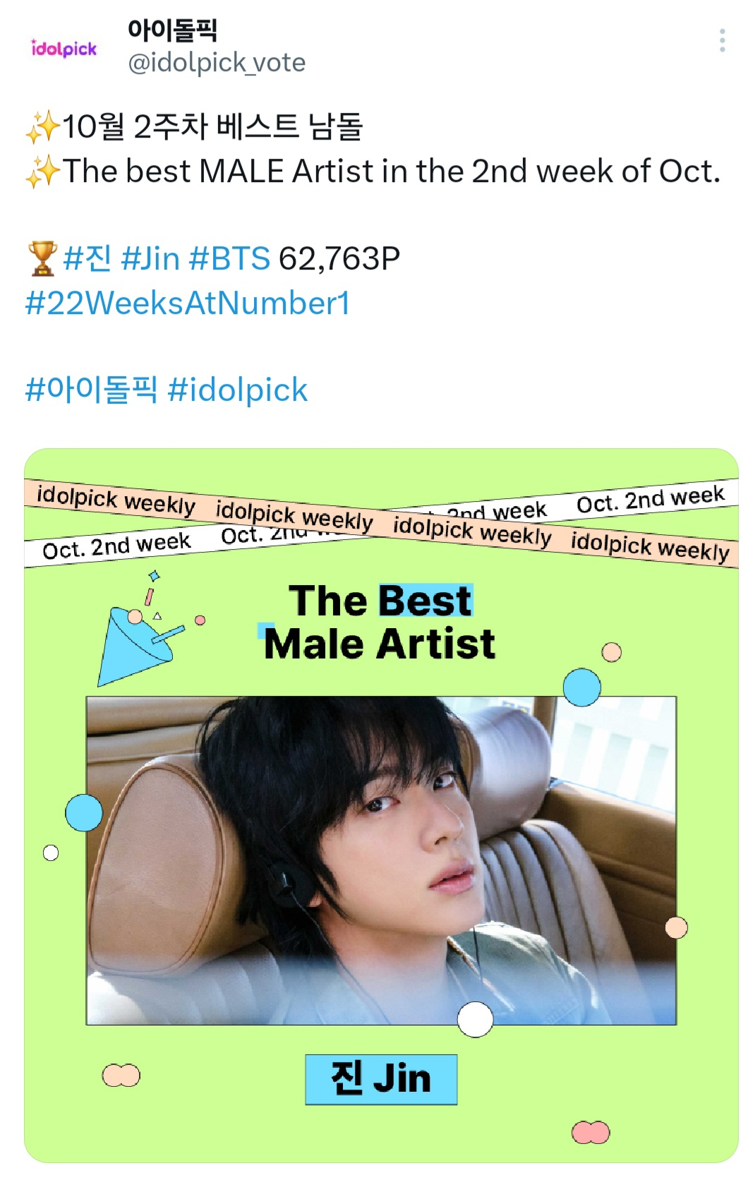 진은 10월 2주차(10월 13일~10월 19일) 위클리 투표에서 6만 2763픽을 얻어 남자 아이돌 개인 부문 1위를 차지했다. 이로써 진은 22주 연속 1위를 달성함과 동시에 최다 득표로 위클리 전체 부문에서도 1위를 기록하며 독보적인 팬덤 파워와 범접 불가한 인기를 과시했다.