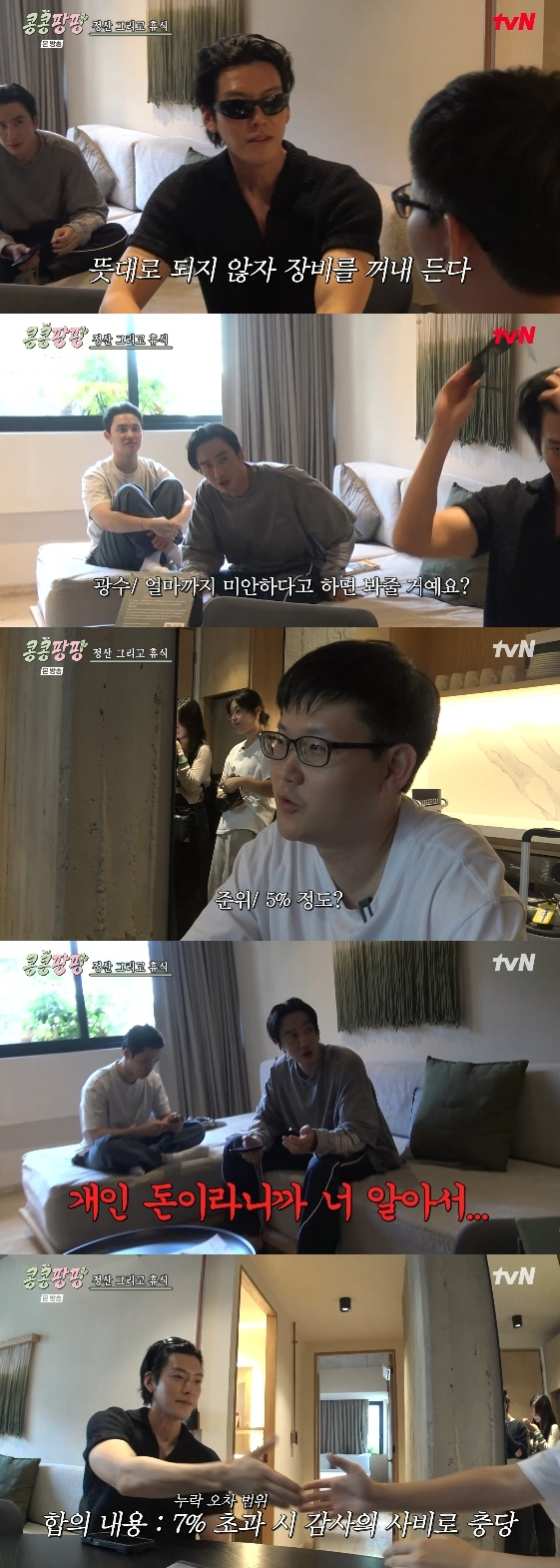배우 김우빈이 여행 경비 처리 방식을 두고 제작진과 신경전을 벌였다. 24일 방송된 tvN 예능 프로그램 '콩 심은 데 콩 나서 웃음팡 행복팡 해외탐방'(이하 '콩콩팡팡') 2화에서는 영수증 처리 방법을 두고 제작진과 갈등하는 'KKPP 푸드' 감사 김우빈의 모습이 그려졌다.