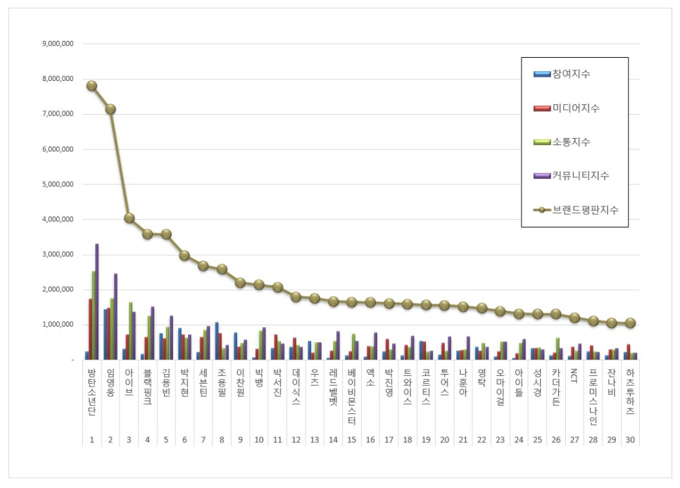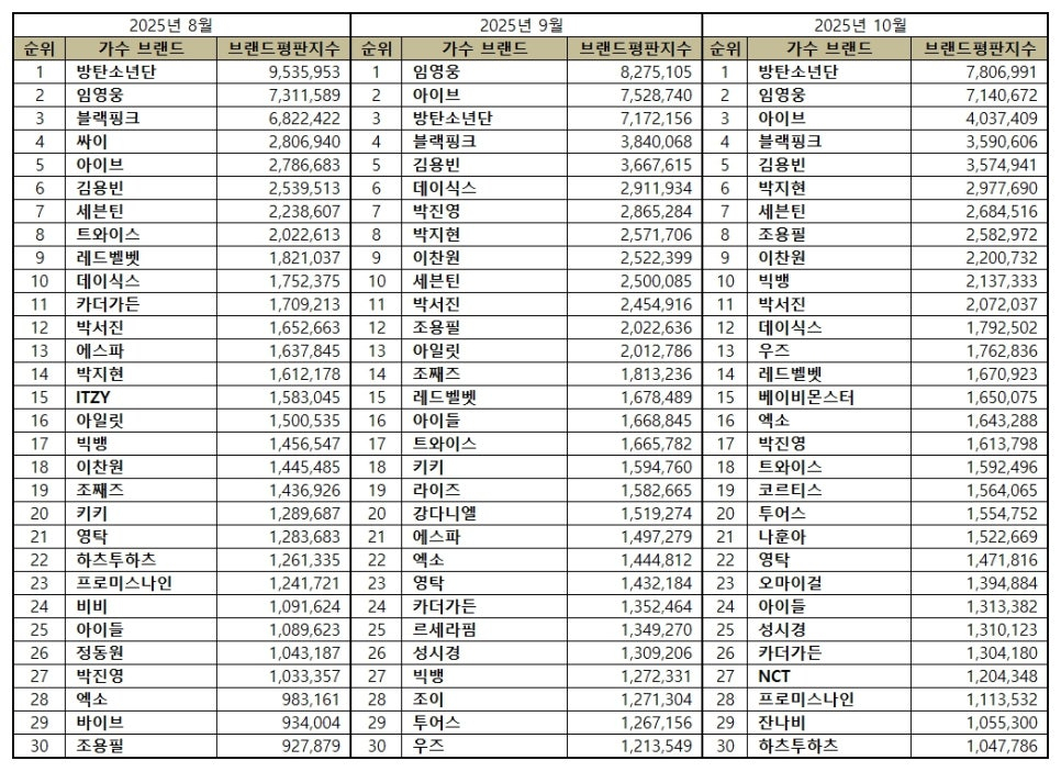 2025년 10월 가수 브랜드평판 30위 순위는 방탄소년단, 임영웅, 아이브, 블랙핑크, 김용빈, 박지현, 세븐틴, 조용필, 이찬원, 빅뱅, 박서진, 데이식스, 우즈, 레드벨벳, 베이비몬스터, 엑소, 박진영, 트와이스, 코르티스, 투어스, 나훈아, 영탁, 오마이걸, 아이들, 성시경, 카더가든, NCT, 프로미스나인, 잔나비, 하츠투하츠 순으로 분석됐다.
