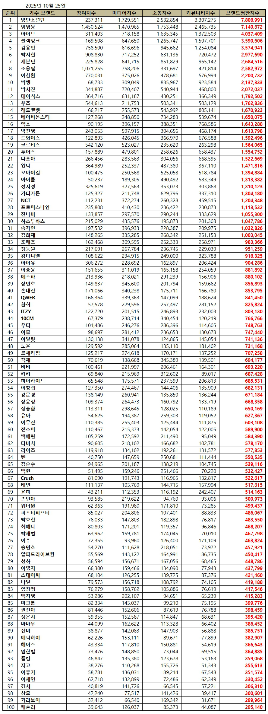 가수 브랜드평판 2025년 10월 빅데이터 분석결과, 1위 방탄소년단 2위 임영웅 3위 아이브 순으로 분석됐다. 한국기업평판연구소는 2025년 9월 25일부터 2025년 10월 25일까지의 가수 브랜드 빅데이터 109,252,107개를 분석하여 소비자들의 브랜드 참여, 미디어, 소통, 커뮤니티 분석을 했다. 지난 9월 가수 브랜드 빅데이터 117,140,823개와 비교하면 6.73% 줄어들었다.