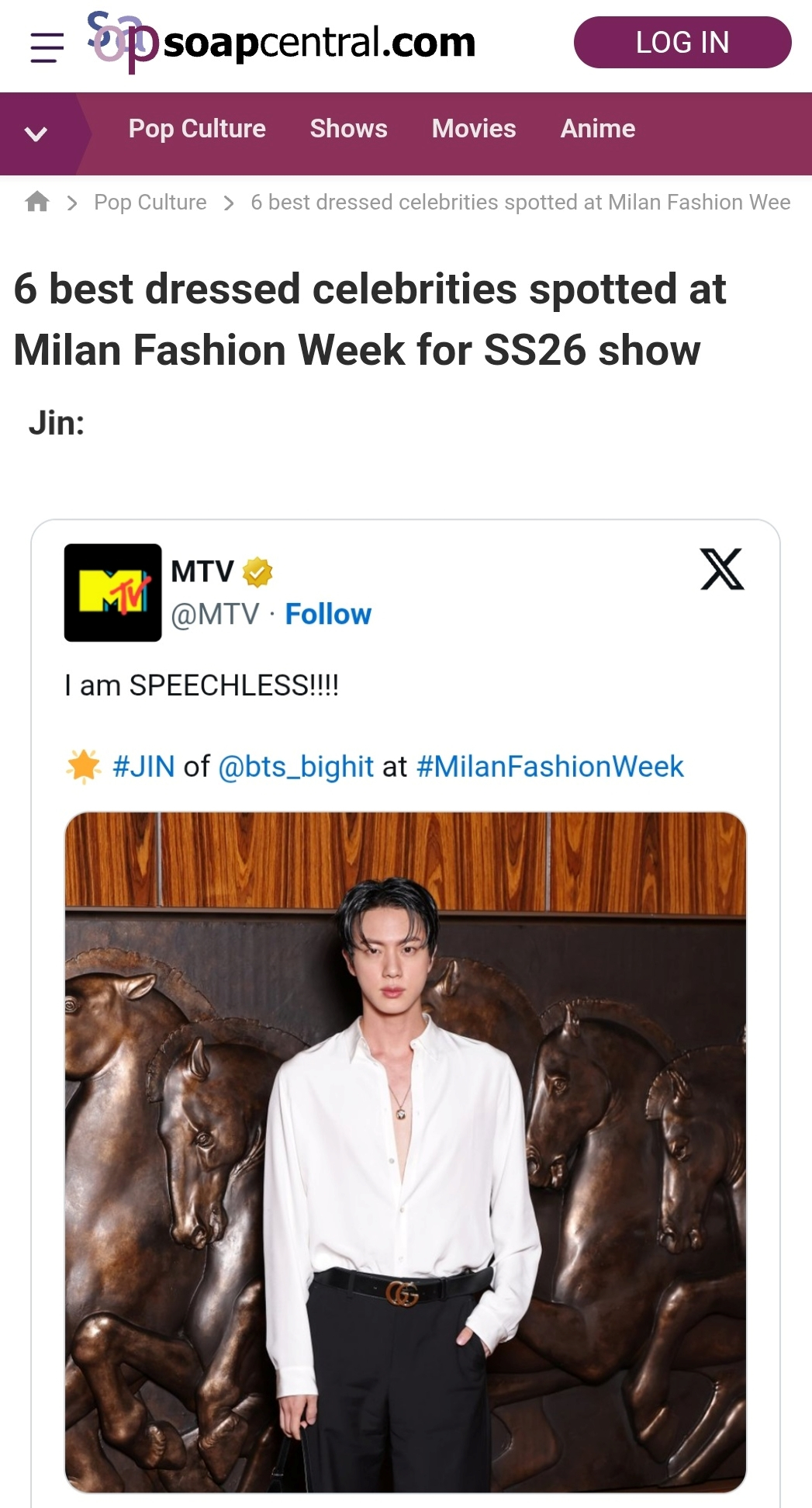 미국 미디어 솝 센트럴(Soap Central)은 진을 밀라노 패션 위크 베스트 드레서 6인 중 하나로 선정, 진의 사진과 함께 "말문이 막혔습니다!!!!"라고 말하는 미국 MTV 공식 계정의 말을 인용하며 찬사를 보냈다.