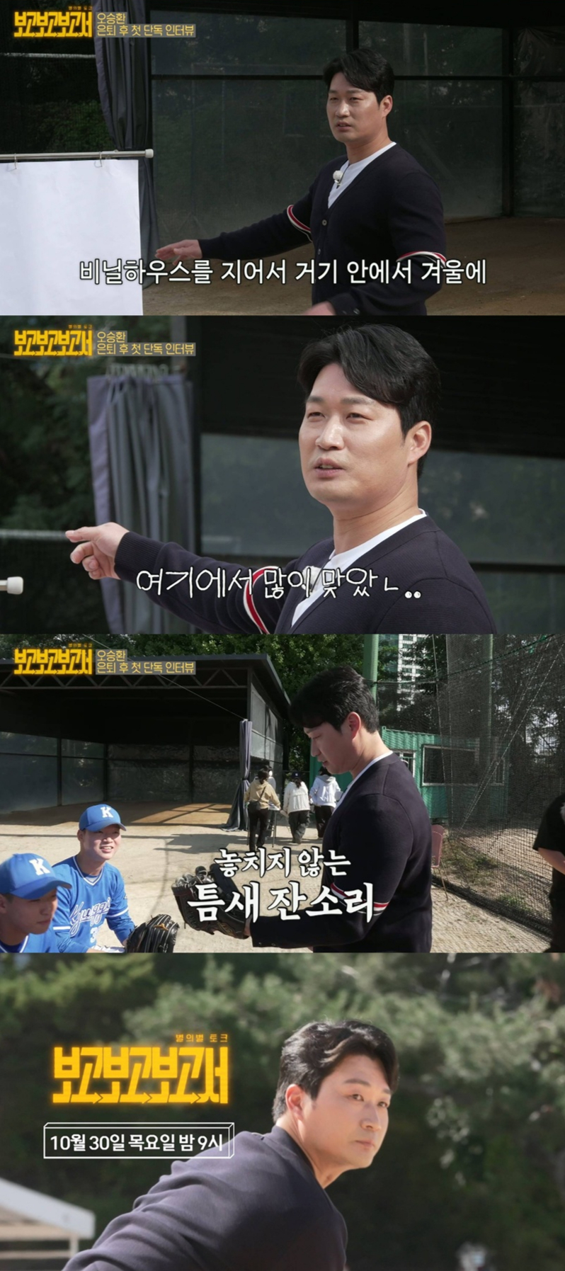 인터뷰를 위해 불펜장으로 들어선 오승환은 추억에 잠긴 듯 잠시 아무 말 없이 공간을 둘러봤다. 오승환은 "실내 연습장이 있었는데 없어졌다. 비닐하우스를 지어서 거기 안에서 겨울에 (연습했다)"며 덤덤하게 학창 시절을 회상했다. 이어 오승환은 "여기에서 많이 맞았는데"라고 너스레를 떨었고, 이와 동시에 화면이 황급히 전환돼 웃음을 안겼다.이어진 장면에서는 은퇴 후 처음으로 마운드에 서는 오승환의 모습이 그려져 눈길을 끌었다. 친근한 선배에서 단숨에 '끝판 대장'의 포스를 되찾은 오승환의 모습은 많은 팬들의 이목을 사로잡았다. 은퇴 후 첫 방송 프로그램에 출연하는 오승환은 과연 어떤 이야기들을 들려줄지 관심이 집중된다. 오는 30일 오후 9시 방송.